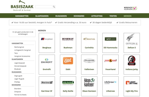 Bushcraft en Survival Store Basiszaak.nl is een webwinkel, en heeft geen showroom. Zij verkopen onder meer tenten, slaapzakken, rugzakken en kleding. Verder kun je er outdoor kookgerei vinden. Het veldkeuken assortiment is zeer uitgebreid, met messen, lampen, (lichtgewicht) pannensets en verschillende branders. Recepten en survival tips lees je op hun weblog.
