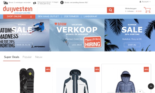 De winkel bestaat al sinds 1955; de webwinkel uiteraard een stuk korter. De webshop verzendt binnen Nederland gratis. Leuker is het natuurlijk om de winkel zélf te bezoeken. Bezoek Duijvestein-Wintersport.nl