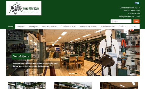 House of Outdoor is een outdoor- en verrekijker specialist in Maarssenbroek. Verdeeld over twee verdiepingen vind je verder een ruim assortiment wandelschoenen en comfortschoenen. Ook zijn ze officieel Garmin dealer, en kunnen ze je dus helpen aan diverse navigatie-apparaten. Op het moment lijken ze geen webshop te hebben.