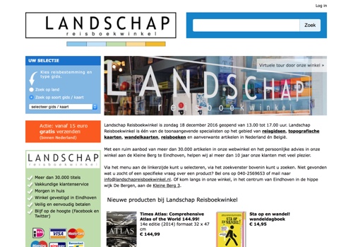 Landschap Reisboekwinkel verkoopt reisgidsen, topografische kaarten, wandelgidsen, reisboeken en aanverwante gidsen en producten. Je vindt de winkel, die al meer dan tien jaar bestaat, aan de Kleine Berg te Eindhoven. Op de website kun je een virtuele tour door de reiswinkel maken.