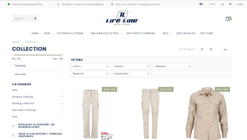 Life-Line heeft in de jaren 80 de afritsbroek binnen Europa geïntroduceerd. Sindsdien is de collectie uitgebreid met onder andere jassen, vesten, truien en t-shirts. In de ontwikkeling van kleding houdt Life-Line rekening met ieder weertype. De collectie heeft diverse functionele eigenschappen zoals: insectwerend, UV beschermend, sneldrogend, waterdicht-/afstotend en lichtgewicht.