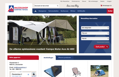 Mazzelshop Camping Totaal verkoopt onder meer tenten, voortenten, luifels, kampeermeubelen, koelboxen, caravan-artikelen, slaapzakken, luchtbedden en -matten, buitenkeukens, gasbarbecues, pannensets en kooktoestellen.