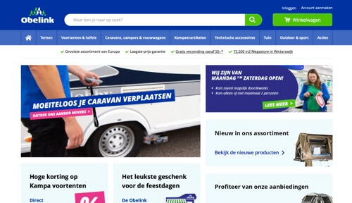 Obelink Vrijetijdsmarkt in Winterswijk is een van de grootste, zo niet dé grootste outdoor- en kampeerwinkels van Nederland. De megastore in Gelderland telt maar liefst 72.500 vierkante meter winkelruimte. Op elke afdeling is vakkundig personeel aanwezig om je te helpen bij je keuze. De winkel is dermate groot dat veel bezoekers er een dagje uit van maken. Obelink bestaat inmiddels al meer dan 65 jaar.