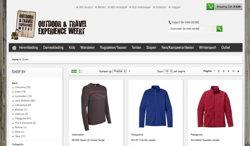 Bekende outdoormerken die verkocht worden door Outdoor & Travel Experience Weert zijn Jack Wolfskin, Bo-Camp, Nomad, Eider, Columbia, Patagonia, Fjallraven, Lowe Alpine, Teva slippers en Meindl. Echte A-merken dus.