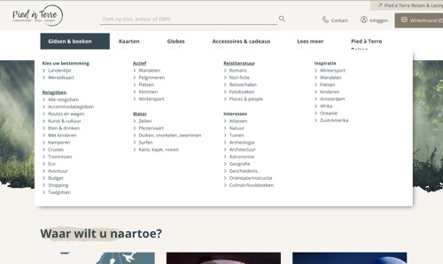 Geografische Reisboekhandel Pied à Terre is specialist in onder andere reisgidsen, wandelgidsen, fietsgidsen, pelgrimeren, bergsportkaarten, landkaarten en wegenkaarten. Een zeer compleet aanbod dus. Bezoek piedaterre.nl.