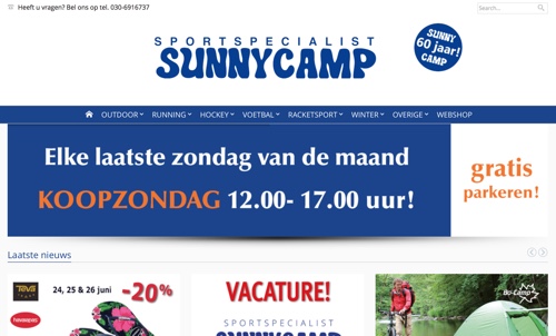 Sunny Camp is een sportspecialist in Zeist, en verkoopt onder meer hockey-, voetbal en tennisproducten. De reden dat ze op outdoorwinkels.nl staan is dat de ze ook outdoor kleding verkopen, alsmede artikelen voor wintersport. De winkel bestaat al meer dan 60 jaar. Bezoek de website van SunnyCamp.